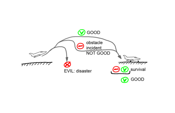 In general, if we want to evaluate the flight as a whole, then we evaluate the ability to overcome death in the entire flight process, and not just the result of survival. Only a flight that has not had incidents and has not suffered a catastrophe will be undisputedly good for the pilot. If there was an incident in flight, even if it did not lead to a catastrophe, but just had a threat of catastrophe, then we will call this flight bad, although the result was still survival. The fact is that we knew about the risk of death in an emergency flight, which was significantly higher than in a good flight without an accident. So, we see that ethics evaluates the success of the process of overcoming death, and not the resulting survival.