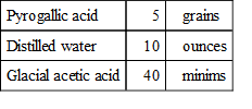 The sulphuric acid and the nitre were mixed together, and immediately the latter was all dissolved, the gun-cotton was added and well stirred with a glass rod for about two minutes; then the cotton was plunged into a large bowl of water and well washed with repeated changes of water until the acid and nitre were washed away. The cotton was then pressed and dried, and converted into collodion by dissolving 30 grains of gun-cotton in 18 fluid ounces of ether and 2 ounces of alcohol—putting the cotton into the ether first, and then adding the alcohol; the collodion allowed to settle and decanted prior to iodizing. The latter operation was performed by adding a sufficient quantity of iodide of silver to each ounce of the plain collodion. Mr. Archer tells how to make the iodide of silver, but the quantity is regulated by the quantity of alcohol in the collodion. When the iodized collodion was ready for use, a glass plate was cleaned and coated with it, and then sensitised by immersion in a bath of nitrate of silver solution—30 grains of nitrate of silver to each ounce of distilled water. From three to five minutes’ immersion in the silver bath was generally sufficient to sensitise the plate. This, of course, had to be done in what is commonly called a dark room. After exposure in the camera, the picture was developed by pouring over the surface of the plate a solution of pyrogallic acid of the following proportions:—