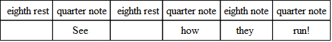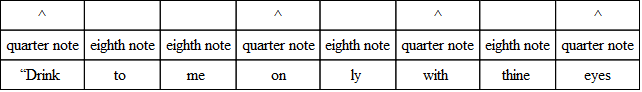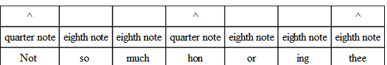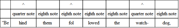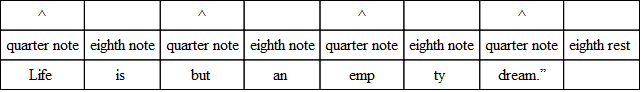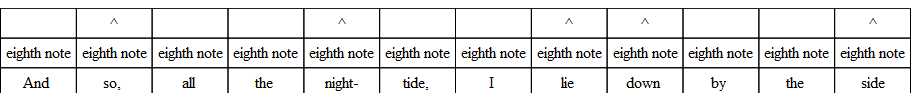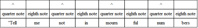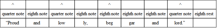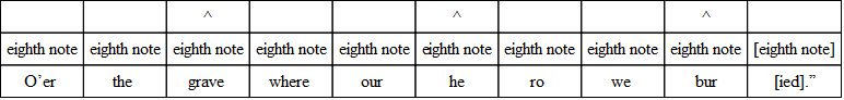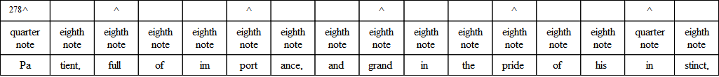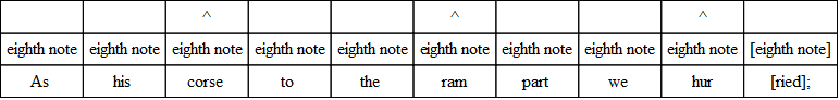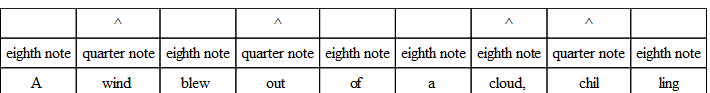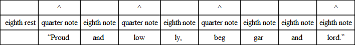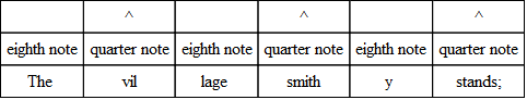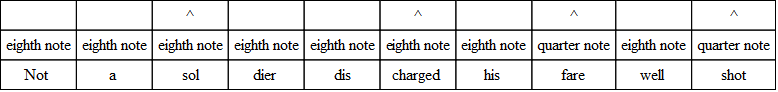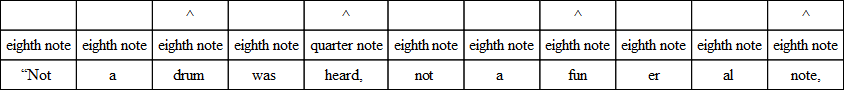 The commonest variation in verse is the substitution of three eighths for the quarter and the eighth, or the eighth and the quarter. And the very opposite of this often occurs; that is, the substitution of the two-syllable foot for the three-syllable foot. The following, from “The Burial of Sir John Moore,” illustrates what is done. Notice, however, that the beat is quite regular, and the lines lilt along as if there were no change.