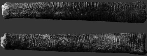 The oldest known indication of the probable use of this procedure dates back to well before the invention of writing by the Sumerians. The so-called Ishango bone (actually two baboon bones) was found in the 1950s on the shores of Lake Edward in what is now the Democratic Republic of Congo and dates back some twenty thousand years. The bones are 10 and 14 centimetres long, and feature a large number of more or less regularly spaced incisions. What was the role of these incisions? It is likely that this was a first counting system. Some people think the bones are a calendar, while others extrapolate an already highly advanced knowledge of arithmetic. It is hard to know for sure. The two bones are now on display in the museum of the Royal Belgian Institute of National Sciences in Brussels.