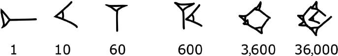 Here we also see the search for a logic in the construction of the symbols. For example, the 60 and the 3,600 are multiplied by 10 when a circle is included inside them. With the arrival of cuneiform writing, these first symbols were gradually transformed into the following: