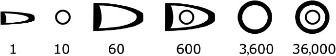 Then, from 60 onwards, groups were introduced, where the same symbols were used to denote groups of 60. Thus, in the same way as in our present-day notation, where the figures read from right to left denote the units, then the tens, then the hundreds, in this Babylonian numeration the units are read first, then the sixties, then the three-thousand-six-hundreds (that is, sixty sixties), and so on, where each rank has a value sixty times greater than its predecessor.