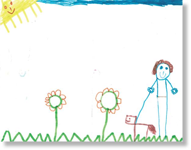 Schematic children begin to attach importance to the relations among the various objects in their drawing. In the following drawing by a 5½ year-old, for instance, you can see a child, a dog and a line (leash) connecting them. The schematic children’s spatial perception also improves, and they often begin the drawing by marking the ground and the sky at the lower and upper edges of the page.