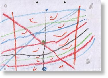 In the following drawing by a 22-month old girl, you can see lines that extend beyond the page’s boundaries, lines with different lengths and directions, without any consistency or personal preference. You can also see asymmetric loops, lines drawn erratically across the pate, cyclical circular scribbles and insertions of the drawing tool into the page, whether vertically or diagonally, to create a “point map” (children enjoy doing this very much, and tend to imitate one another around the drawing table at kindergarten).