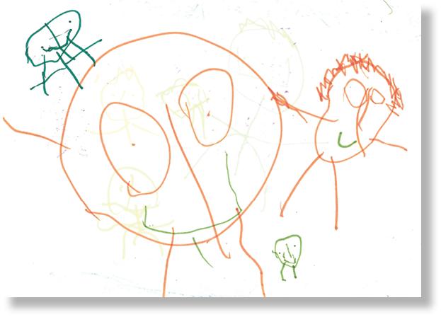 Usually, children at the structured scribbling stage are happy to talk about what they have drawn, and will explain about the various elements on the page.