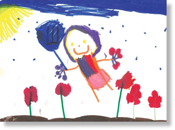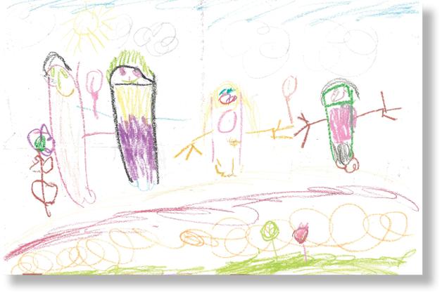 This emphasis can make the drawing seem surreal, as in the following drawing by a 5 years and 2 months-old girl. For this girl, the most important thing is to draw the figures holding balloons or each other’s hands. Therefore, she allowed herself to ignore their legs (which is not typical of her other drawings).