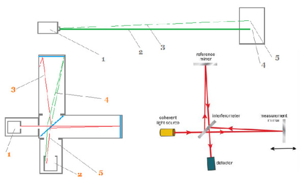 Figure above. The author’s experience with the deflection of a laser beam due to entrainment by the ether. 1. Laser (rigidly fixed, having a remote power source and switch, laser pointer). 2. Laser beam when turned on at 9 o’clock in the morning. 3. Beam when the laser is turned on at 17 o’clock. For clarity, the beam deflection angle is increased. 4. Place the beam mark on the screen at 9 o’clock in the morning. 5. Place of the beam mark at 17 o’clock. The screen and the laser are separated by a distance of 90 m. The difference between the positions of the light spot in the morning and in the evening (during five days of research) is 3 cm. 1. Light source 2. Detector (screen for observing the interference pattern). 3. Beam initially reflected perpendicular to the interferometer arm and deflected by the ether flow to the left. 4. A ray emitted towards the stream of ether, and therefore participating in the construction of an interference picture. 5. Beam reflected from the mirror of the interferometer arm, presumably directed along the flow. This ray is also bent by the ether.