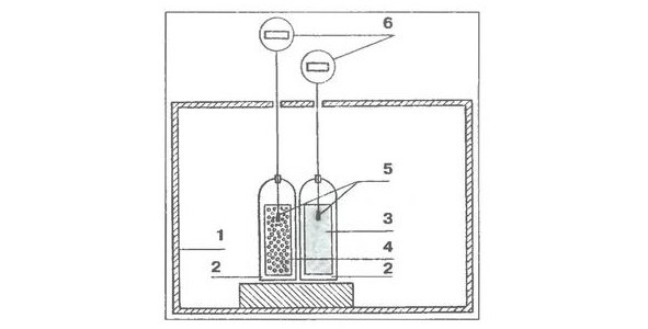 Experiment with granular and homogeneous media. 1. cabinet with thermal insulation 2. Dewar vessels 3. continuous medium (water) 4. porous medium 5. electronic thermometers. 6. temperature sensors.