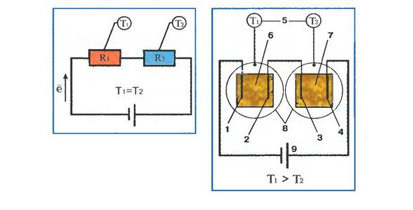 «Some fundamental laws of physics are so simple and obvious that no one doubts their validity and no one is engaged in their verification. In particular, this concerns Ohm’s law, according to which the strength of the direct current in the circuit (at least with its low density) is equal to the quotient of dividing the voltage by the resistance: I = U / R. Other electrical engineering rules follow from this. For example, according to the Joule-Lenz law, the heat W generated at the resistance R is directly proportional to the voltage drop U across it, the current I and the duration of its passage t, that is, W = R-U-1-t. Therefore, if two identical resistances are connected in series in a closed circuit, then the same amount of heat should be released on them per unit of time. It seems quite obvious that, bypassing the first resistance, electrons are not able to either acquire additional energy or lose it. But is Ohm’s law really fulfilled for resistances of all kinds at low current densities? Having become interested in this issue, I performed a series of simple experiments. I connected two, if possible, identical resistances to the DC circuit, and next to them I attached sensors of sensitive thermometers. Each resistance together with its „own“ sensor was placed in a separate thermostat. In the first experiments, I used incandescent lamps (rated for a voltage of 2.5 V and a current of 0.15 A) as resistances. Turning on the current (its source was a stabilizing step-down transformer and a rectifier connected to a household circuit with a voltage of 220 V), I measured the temperature in thermostats for an hour; then swapped lamps and repeated measurements. Five series of similar experiments showed that metal resistances emitted an amount of heat in full accordance with the classical laws of electrical engineering, regardless of where these resistances were located. I did not carry out measurements using other types of resistances, but I performed the experiment using electrolytic cells as resistance, in which ordinary tap water decomposed on stainless steel electrodes. The result, again, did not reveal any anomalies. But if the electrolysis of water was carried out in a porous, inhomogeneous medium, the picture turned out to be different. I filled the electrolytic cells with a mixture of quartz sand and tap water, acidified for better electrical conductivity with a few drops of hydrochloric acid (which, generally speaking, is not necessary). And the very first experiments gave amazing results that did not correspond to the classical laws of electrical engineering. Namely, the temperature in the thermostat located in the direction of the electrons’ movement turned out to be significantly higher than the temperature in the next thermostat! With a voltage of the current source of 220 V and its strength of 0.5 A, the difference was 90C, which significantly exceeded the error value of previous experiments. In total, I performed 10 similar experiments and noticed that the temperature difference between the cells clearly depends on the current in the circuit and can even reach several tens of degrees. I also noticed that the voltage drop on the first cell was higher than on the second (150 and 70 V, respectively), which explains the increased heat generation. But the main question remained unanswered: why does such a noticeable asymmetry arise, if before and after the experiments the resistance of the cells were the same? After all, this effect should not be! It can be assumed that in the first cell the electrons lose part of some of their internal energy and therefore in the second cell are no longer able to interact with ions as intensely. But after all, the second cell also (although not a style) heats up. True, in sand-water electrolytic cells there are many local and rather sharp drops in the resistance of the medium, as a result of which the electrons in it are either sharply accelerated, then sharply slowed down. Is this the reason for the effect I observed?..»