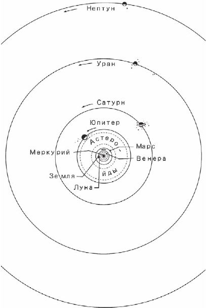 Ради простоты мы изобразили все орбиты в форме кругов. Но в действительности планетные орбиты немного сжаты, овальны, и Солнце находится не в срединной точке каждого овала, а несколько сбоку от центра. Отсюда происходит, между прочим, то, что, обращаясь вокруг Солнца, каждая планета не отстоит от него все время на одинаковом расстоянии, а то приближается к нему, то удаляется, в зависимости от того, насколько вытянута ее овальная орбита.