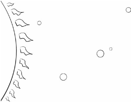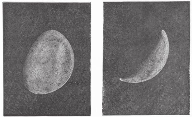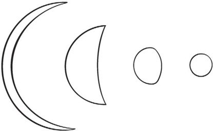 Если в вашем распоряжении имеется хотя бы самая скромная зрительная труба, то, направивши ее на Венеру в пору наибольшего блеска, вы будете поражены странной неожиданностью: планета имеет форму не кружка, а серпа, как у молодого месяца! Глядя на этот светлый серп, мы воочию убеждаемся, что перед нами – небесное тело совсем иной природы, нежели далекие раскаленные солнца-звезды, испускающие свой собственный свет. Как и всякая планета, Венера – шар, сам по себе темный, освещаемый Солнцем лишь на одной половине; и когда эта освещенная половина обращается к нам боком, мы видим только более или менее узкий серп, – остальная, темная часть диска остается для нас невидимой. Вот почему, кружась между Землей и Солнцем, Венера показывает нам те же фазы, что и Луна. Разница лишь в том, что Луна отдалена от нас во всех фазах одинаково; Венера же бывает то ближе, то дальше от нас, и оттого фазы ее резко различаются по величине: узкий серп очень велик по сравнению с первой четвертью, которая в свою очередь заметно больше полного диска (см. рис.).