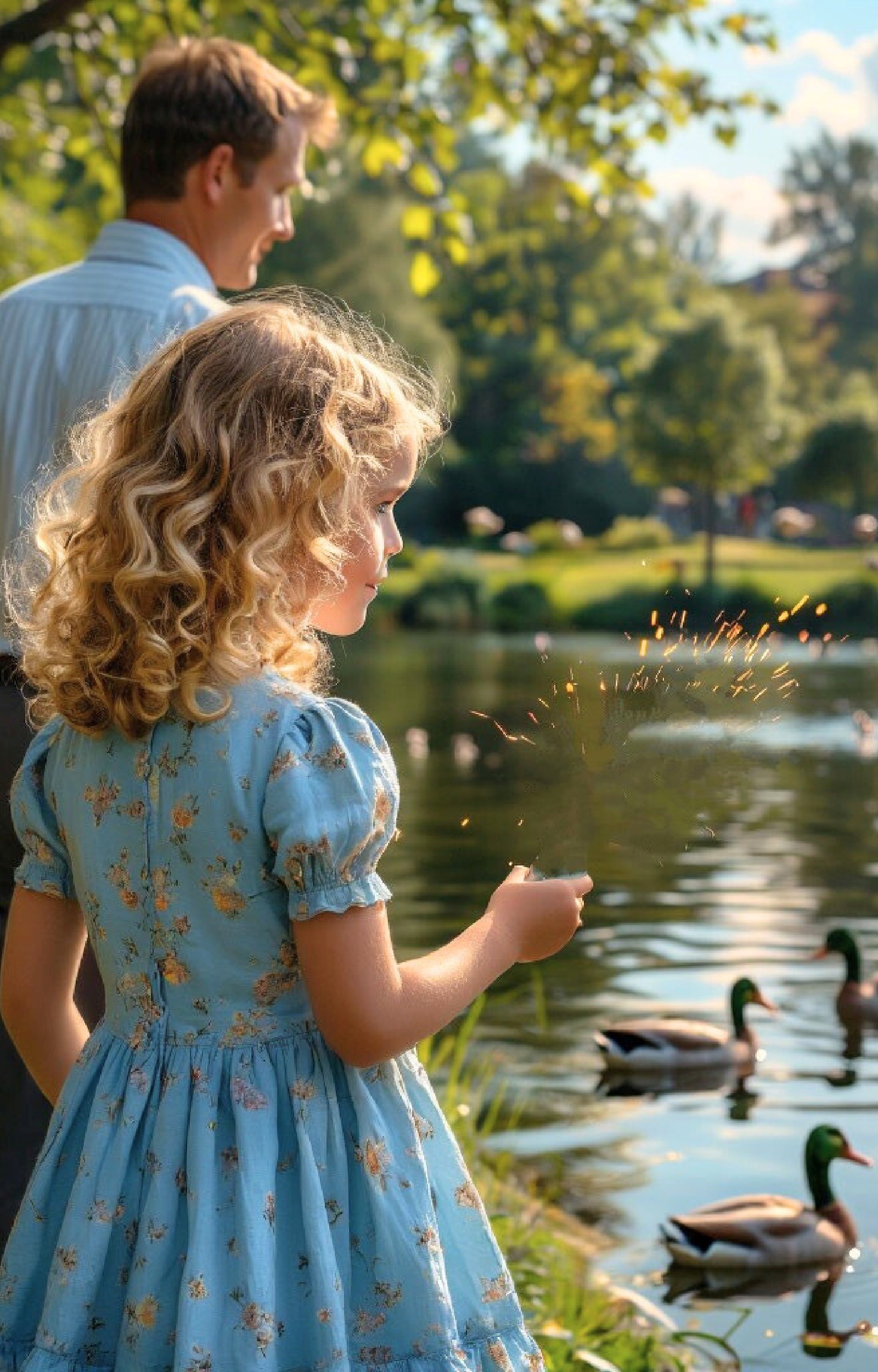 Мама сидела на скамье напротив, наблюдая за рябью на воде и улыбаясь своим мыслям. Солнце окутывало всех тёплым покрывалом – уже не обжигающим, а добрым и ласковым. Последний сухарик достался селезню, папа отряхнул ладони и подсел к маме. Они сидели рядышком, их плечи слегка соприкасались, и в тишине звучала безмятежность чудесного дня.