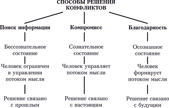 Поиск информации, компромисс, благодарность – три решения всех существующих конфликтов. Т.к. основа конфликтологии это разрыв во времени, то и решения связаны со временем, но с прошлым (поиск), настоящим (компромисс) или будущим (благодарность) – это зависит от потенциала Души и качества его передачи.