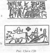 Задачу окультуривания растений и одомашнивания животных поручили Энки и Энлилю. Они отправились в ДУ.КУ, «место очищения», или «комнату творения», и создали там Лахар («скот, дающий шерсть») и Аншан («зерно»). Для Лахара они сделали загон, а для Аншана – плуг и ярмо. На шумерских цилиндрических печатях запечатлена передача первого плуга человеку (рис. 13а), а также процесс вспахивания земли, где плуг тянут быки (рис. 13b). Предположительно создателем Аншан был Энлиль, хотя нельзя исключить вероятность того, что это сын Энлиля Нинурта, которого прозвали «пахарем».