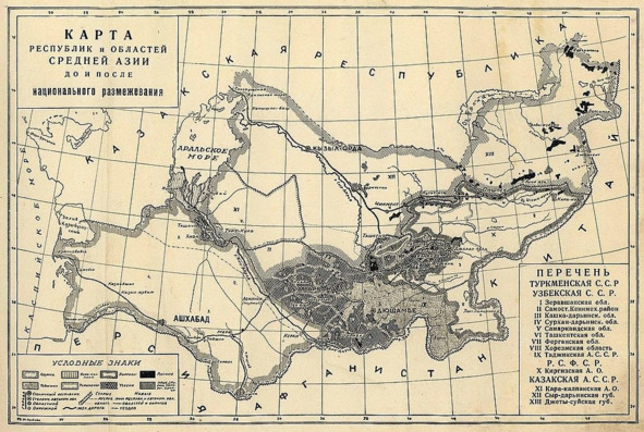 Границы советских республик Средней Азии далеко не всегда совпадали с границами этнического расселения ее народов, поэтому при присоединении ее к СССР происходила их перекройка по национальному признаку, и в результате на месте прежних республик образовались новые. 27 октября 1924 г. в состав СССР вошла образованная в результате выделения территорий, населенных туркменами, из РСФСР и Бухарской ССР, Туркменская ССР. В том же году государственную независимость провозгласила вновь созданная из населенных узбеками территорий РСФСР, Бухарской ССР и Хивинской Народной Советской Республики Узбекская ССР. 13 мая 1925 г. она присоединилась к Советскому Союзу. 16 октября 1929 г. как отдельная республика из состава Узбекской ССР была выделена Таджикская ССР, в которую вошли населенные преимущественно таджиками горные районы Памира и связанных с ним массивов. 5 декабря она также присоединилась к СССР.