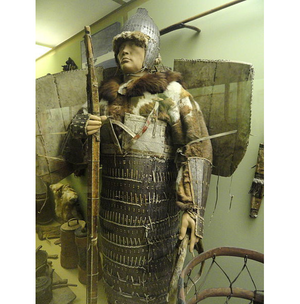 Воинские доспехи и сухожильный лук чукчи, XIX век. Экспонат Американского музея естественной истории, Манхэттен, Нью-Йорк, США