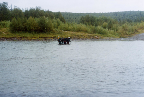 Подъем 8.35, клеили полиэтилен, с 9.10 готовили завтрак. Солнечно, по горизонту белесо.10.40 сели завтракать. Затягивает.12.21 – 13.00 – переправа – 13.05 – на сыпухе. Уклонились к западу по высоким травам и тальникам. Перешли вброд, отжались.13.24 – 13.33. Подъем.13.49 – 13.55. Продолжали подъем, вышли на плато.14.05 – 14.23. Вверх через тальники, сидим на камне.14.29 – 14.38. Миновали тальники, жуем сало.15.10 – 15.33. Перешли не тот водораздел, оказались на западном плато Обе-Иза. Выскакивал в разведку на хребетик.15.53 – 16.01. Прем на хребетик. Вышли почти на перевал.16.08 – 16.36. Озерко в истоках Сывь-Ю. Пьем.16.49 – 16.55. Перешли по-сухому исток Сывь-Ю, налили фляжку.17.00 – 17.21. Прошли несколько истоков (левых), остановились, не набрав высоты.17.30 – 17.50. Только двинулись – Лена упала голеностопом, дальше шла очень медленно. Встали, разгрузили.18.04 – 18.24. Пошла быстрее, но не очень. Виден лес, будем двигаться туда на ночь.18.30 – 18.55. Перешли ручеек в лесу, поставили бивак.Готовили ужин с 19.30.Легли порядка 22.30.Ходовое время: 237 минут. Расстояние: 11 км.Утро сияло. Солнце еще не успело согнать с зелени бриллиантовые капли, и вся поляна светилась теплым золотом. Жгло даже сквозь полиэтилен.