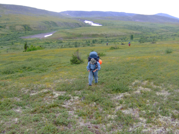 Дальнейший путь на день сразу стал очевиден: из россыпей пришлось стремительно выбираться и перемещаться ближе к долине ручья, там, вроде бы, казалось позеленее. Колея, по которой мы шли до принятия мной гениального решения укамениться, как раз прочерчивала отлогие зеленки и заглядывала за тот лоб, куда мне вздумалось впереться. Но и она радовала нас недолго, как, видимо, и ее создателей: за поворотом полочка круто обрывалась вниз, дальше простирался весьма неудобоваримый даже для пешехода склон. Посидели, я сбегал на выкат, глянул вниз, вернулся и с надеждой в глазах провозгласил, что тут осталось – чуточки, запросто спустимся. Не так уж запросто оказалось. Организмы, изнуренные дождем, былой тряской и нашим со Светой настроением, напрочь отказывались применять вестибулярную систему по назначению. Гироскопы скрипели в своих кардановых подвесах, процессоры грелись и дурили. Ноги спотыкались. Ноги скользили. Ноги вставали совсем не туда, куда хотели глаза; глаза видели совсем не ту дорогу, которую желали бы ноги. Что говорить – первый день часто комом. Утешал внезапный подброс, благодаря которому мы все же оказались значительно дальше, чем планировалось прочапать пешком. щаз 46