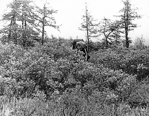 Очень не хотелось терять высоту. Внимательно изучив карту, я сделал глубокомысленный вывод о том, что правый по ходу борт долины для нас предпочтительнее – уж не помню, из каких соображений. Вероятно, масштабы окружающего мира все еще не могли вместиться в мою систему ориентирования, и здоровенная чаша долины впереди не внушала мне пока должного пиетета. В самом деле, в долине этого невзрачного ручья плюс тех притоков Сывь-Ю, что маячили за водоразделом, спокойно умещались верховья Вишеры вплоть до Ниолса, а я никак не мог это усвоить. Предпринятая авантюра характеризовалась новыми для меня единицами измерения расстояний, отличными от тех, к которым привык в теснинах Кавказа, центральной части Приполярного или на Северном Урале – километров. Убогое воображение еще несколько дней пыталось вместить это понятие в себя, потом плюнуло и передало функции управления ногам и находящейся неподалеку душе. Странно – они справились. 49 50 сотнями