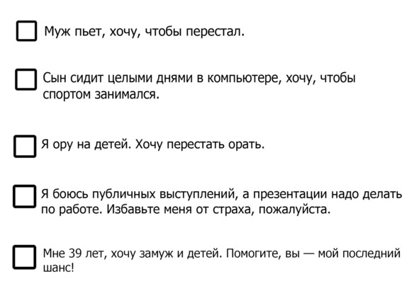 Я всегда всерьез отношусь к тому, чего человек хочет от нашей с ним работы. Но точно так же всерьез я отношусь и к себе: к тому, кем я являюсь, что укладывается в границы моей компетентности, а что явно выходит за ее пределы. И тут мы либо переформулируем запрос и договоримся, либо человеку понадобится другой специалист, который предскажет будущее, снимет порчу, сделает «приворот», «отворот» или «заговор». Терапевт не золотая рыбка, он больше всего похож на джинна из анекдота «Домой хочу».