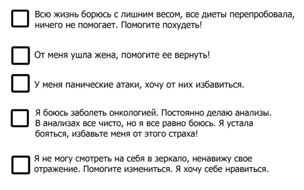 Я буду за клиента-ведущего называть то, с чем могут прийти на терапию.