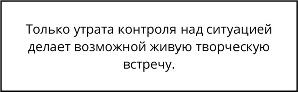 Только не зная, что другой сейчас привнесет в контакт, как отреагирует, как повлияет на происходящее, можно быть вместе по-настоящему живо и творчески. Только в живой и творческой атмосфере возможна та важная и глубокая трансформация, которой так радуются все участники терапевтического процесса, когда он подходит к своему благополучному завершению.