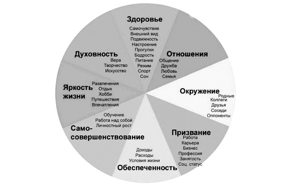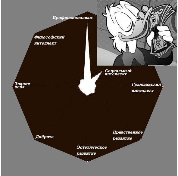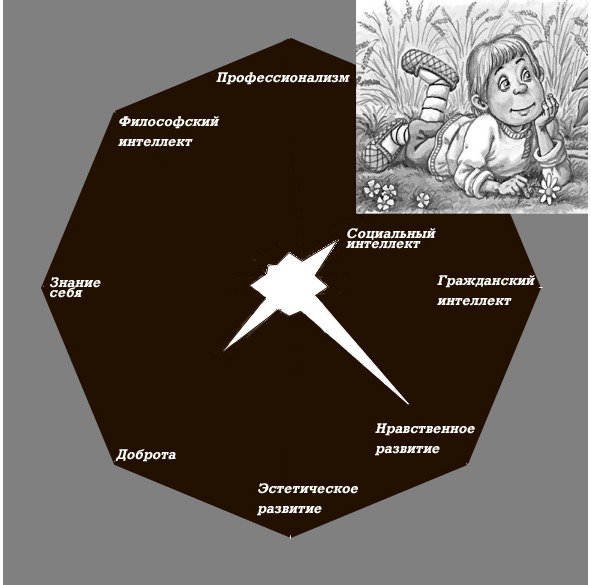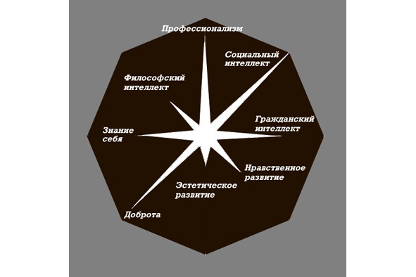Состояние развития человека можно описывать восьмеркой параметров: 1) доброта, 2) нравственность, 3) эстетическое развитие, 4) профессионализм, 5) знание себя, 6) знание людей (социальный интеллект), 7) знание общества (гражданский интеллект), 8) знание мира (философский интеллект, или мудрость).