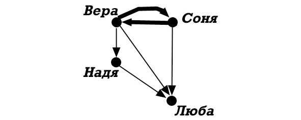 При этом, естественно, исключаются все случаи, когда прямо или косвенно «кукушка хвалит петуха за то, что хвалит он кукушку» (говоря формально на языке математической теории графов, исключаются все циклы в социометрическом ориентированном графе).