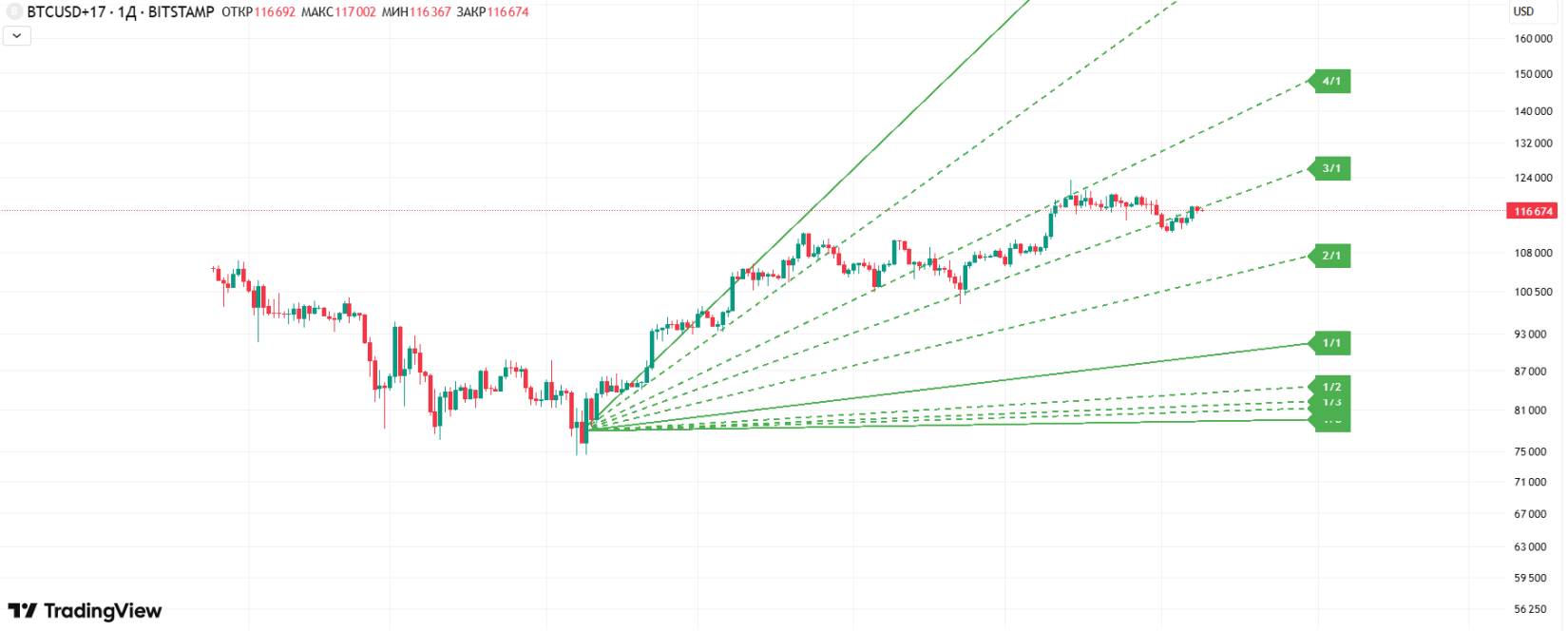 Рисунок 8 Индикатор углов Ганна (Gann Fan Master) на графике Биткоина